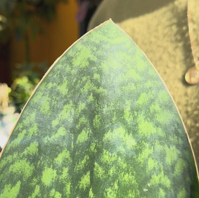 Sansevieria ‘Whale Fin’ ‘Victoria’ (also known as Dracaena masoniana) is a striking, sculptural houseplant grown for its broad, paddle-shaped leaf with beautifully marbled green patterning. This cultivar, ‘Victoria’, is especially sought after for its refined markings and elegant form.